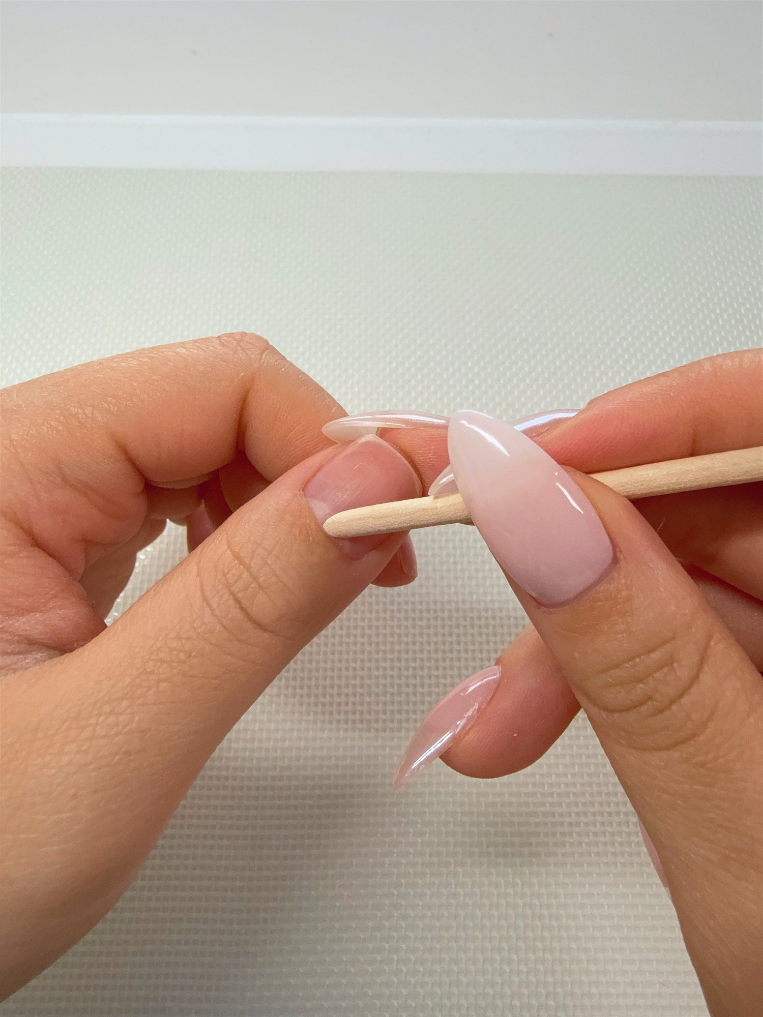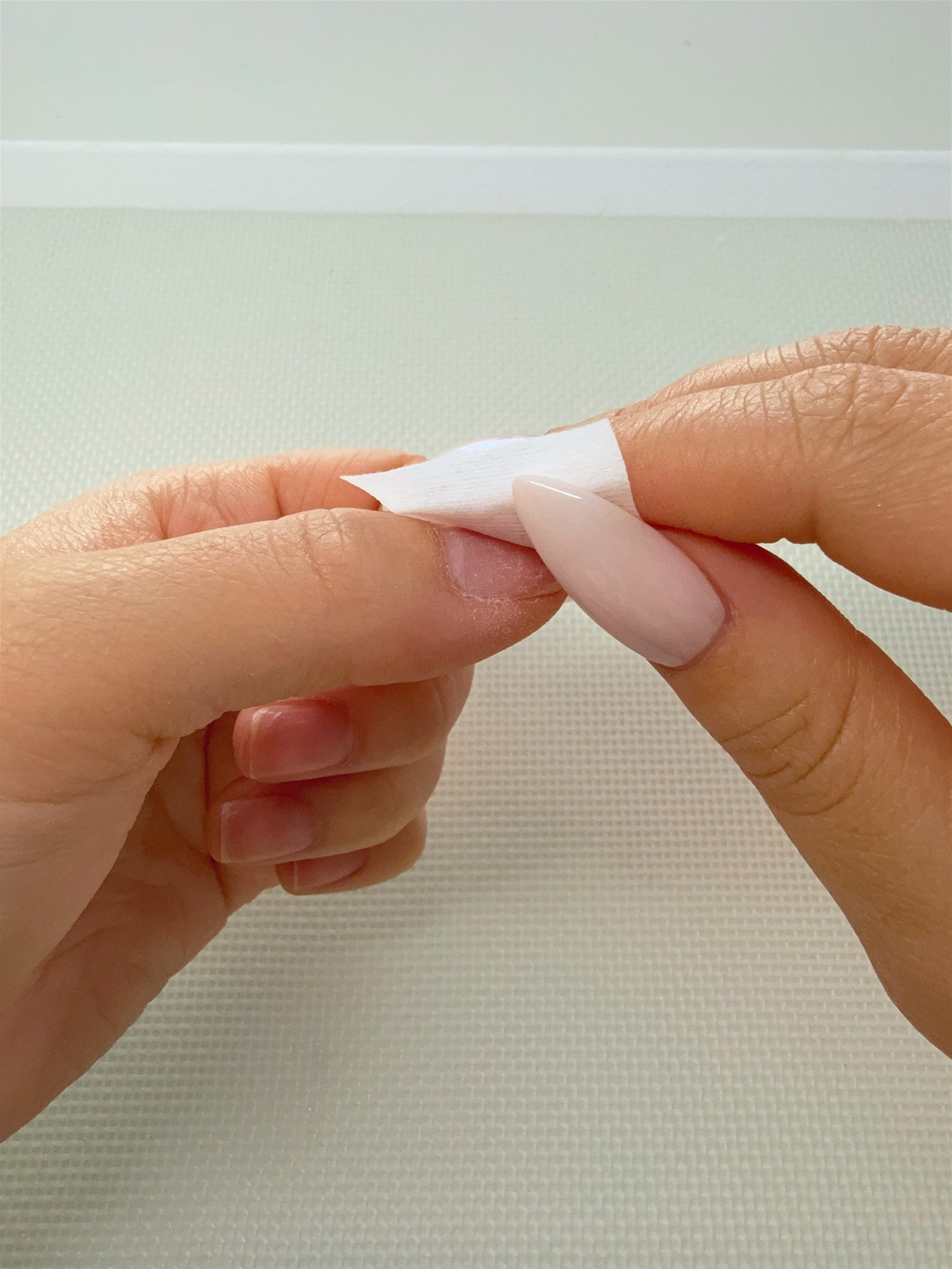 Wipe the entirety of your nail beds with the alcohol pad to remove dust and dehydrate the nail bed. Don’t touch your nail beds from here on out as this will cause oils to go back onto the nail bed and affect adhesion!