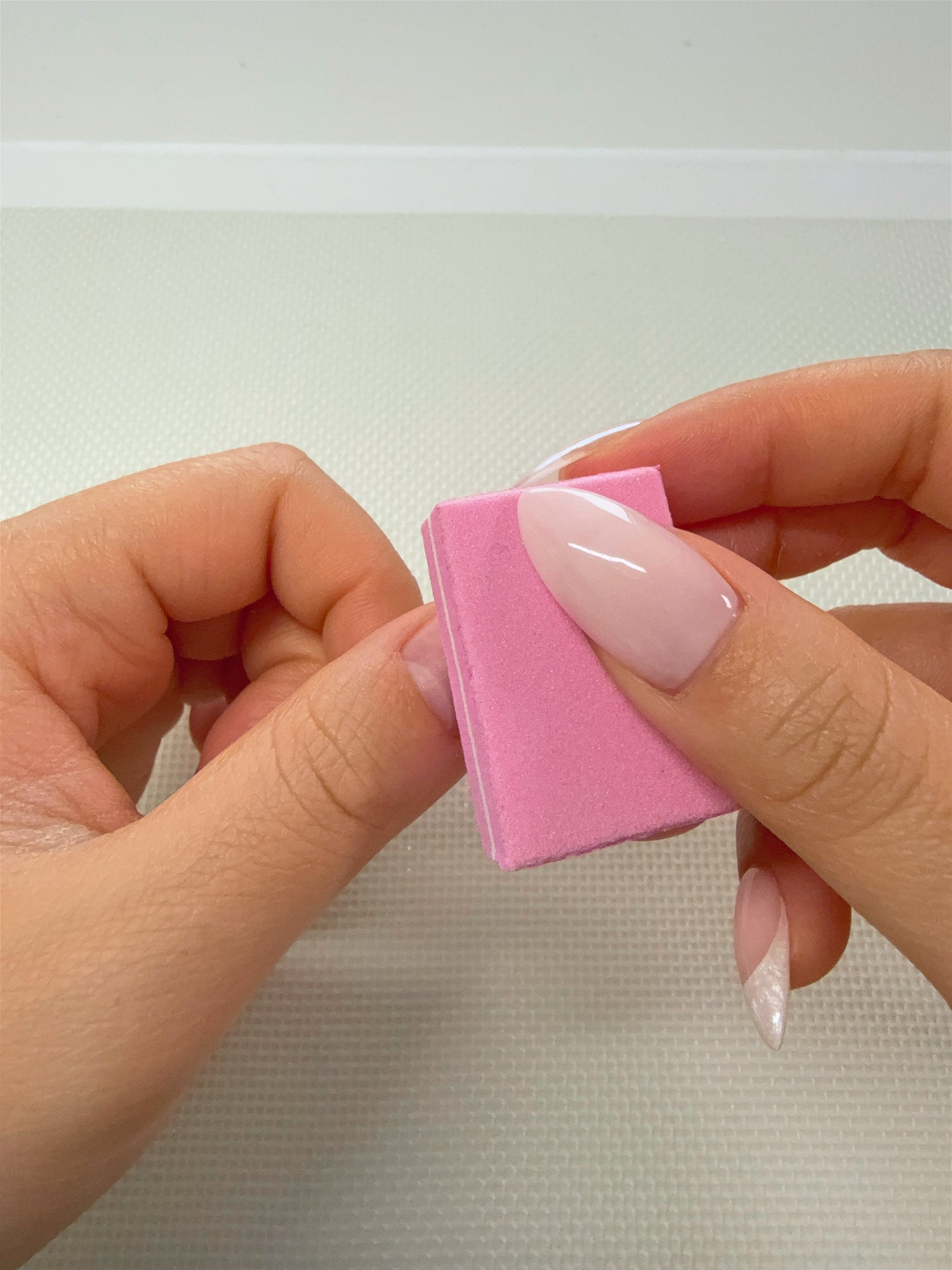 Buff the entirety of your nail beds (especially close to the cuticle line) with the coarse side of the buffer to remove oils, shine and to create a rough(ish) surface for optimum adhesion.
