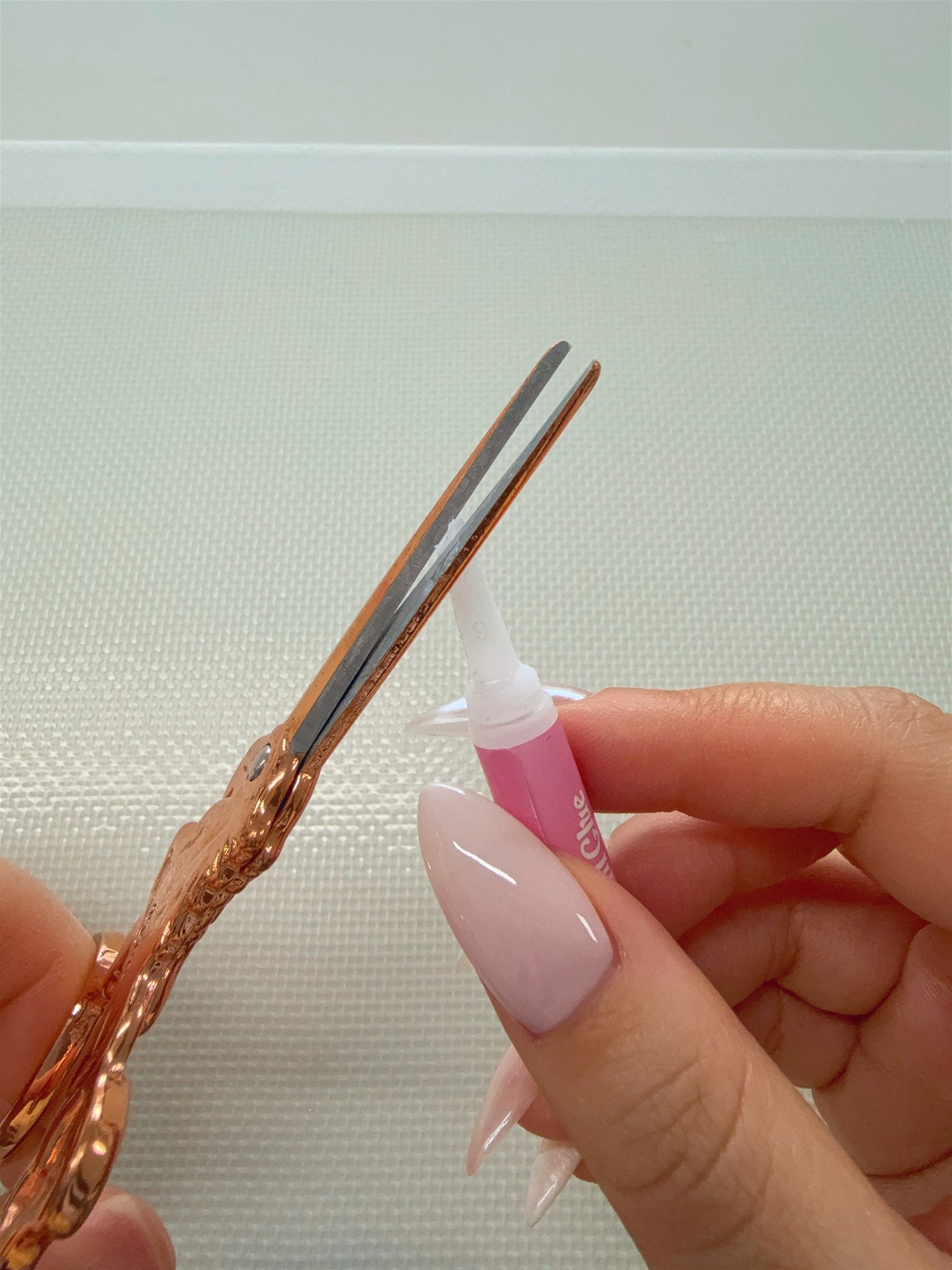 Cut the tip of the glue, ensuring the nozzle is facing away from yourself (you could also do this first before starting your nail prep).