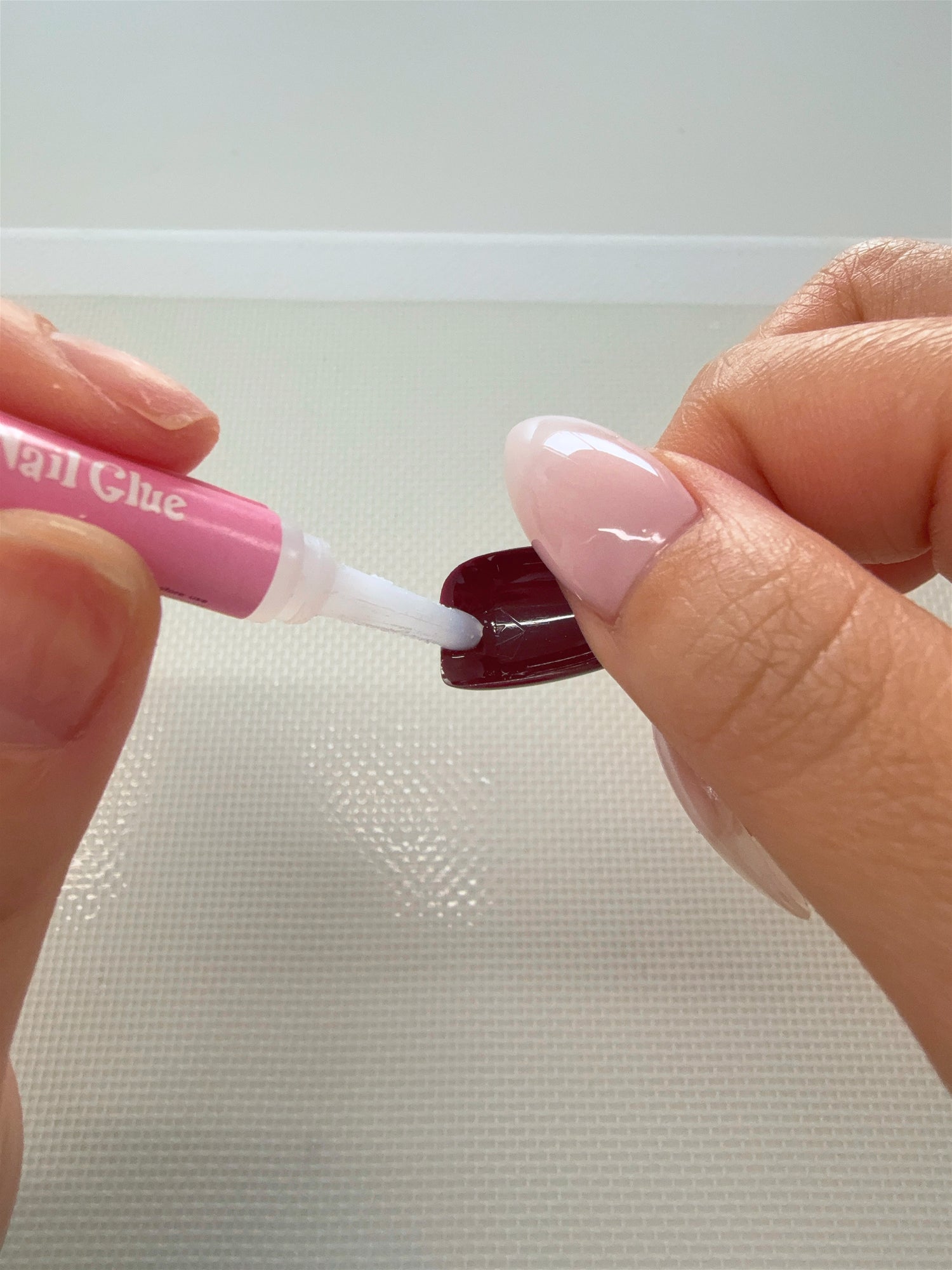 Work with one finger at a time to avoid having the nail glue dry out. Dab just enough glue to cover 3/4 of your nail bed (from the tip of your nail inwards), avoiding the cuticle and surrounding skin.