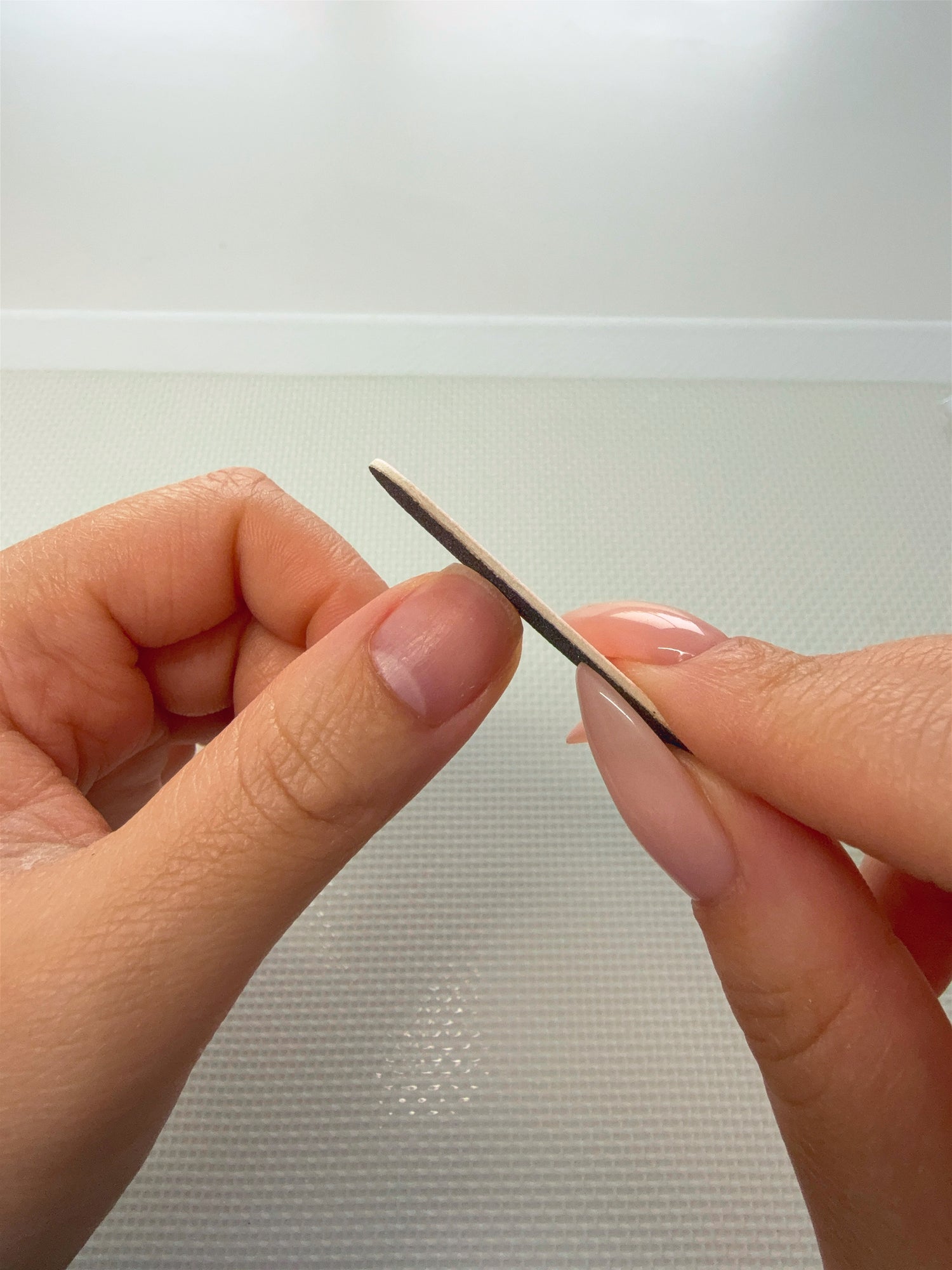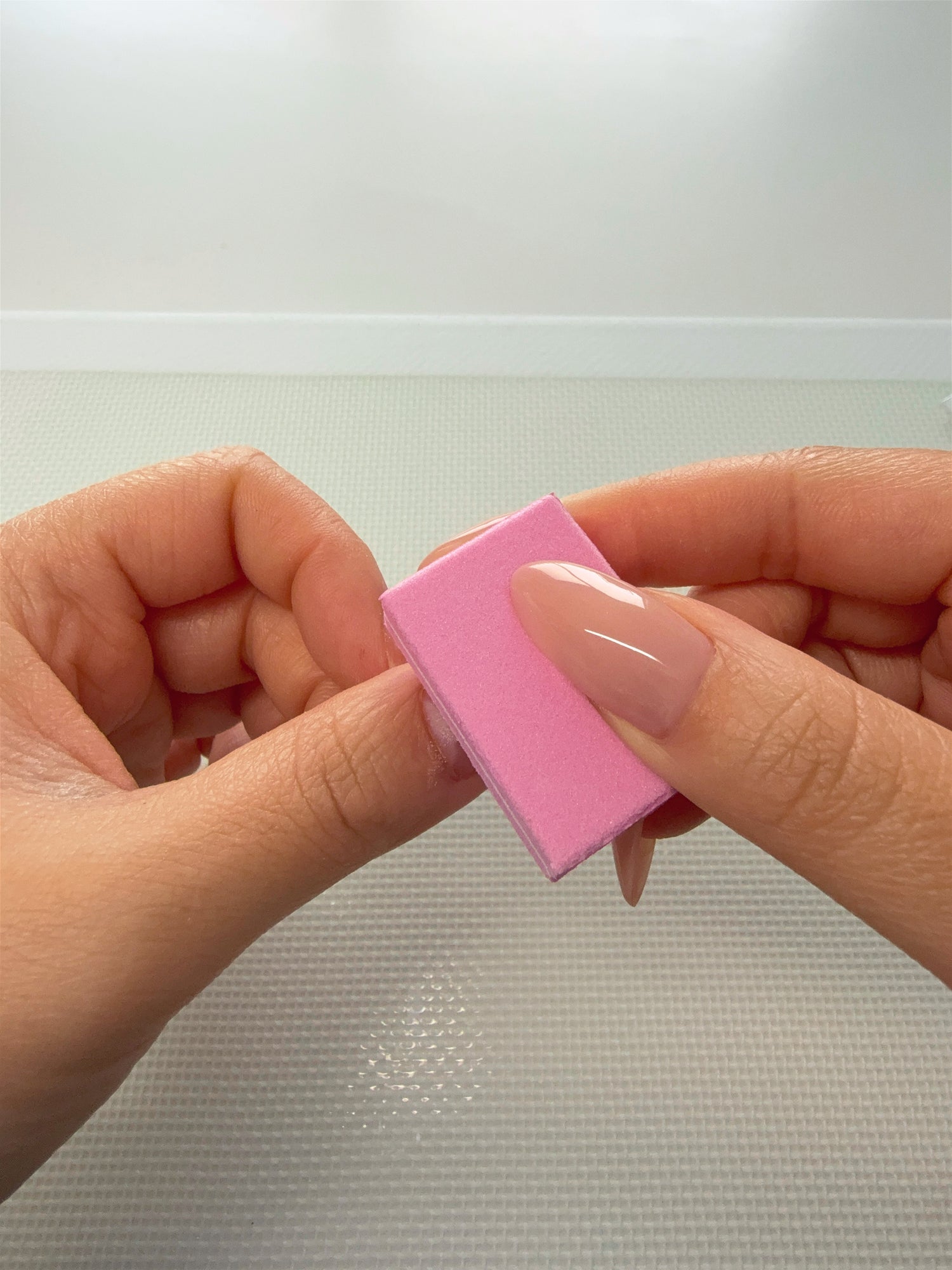 Buff the entirety of your nail beds (especially close to the cuticle line) with the coarse side of the buffer to remove oils, shine and to create a rough(ish) surface for optimum adhesion.