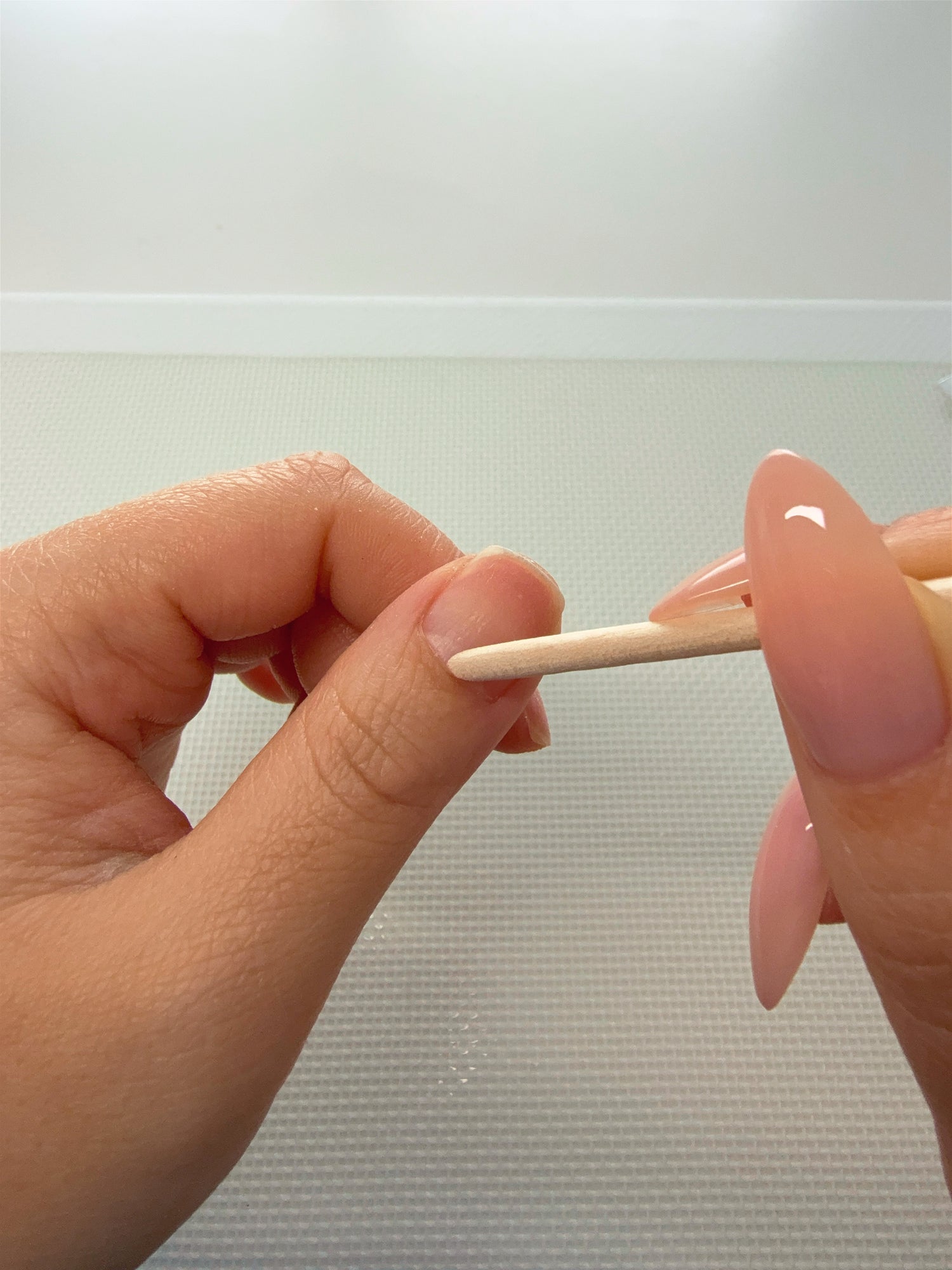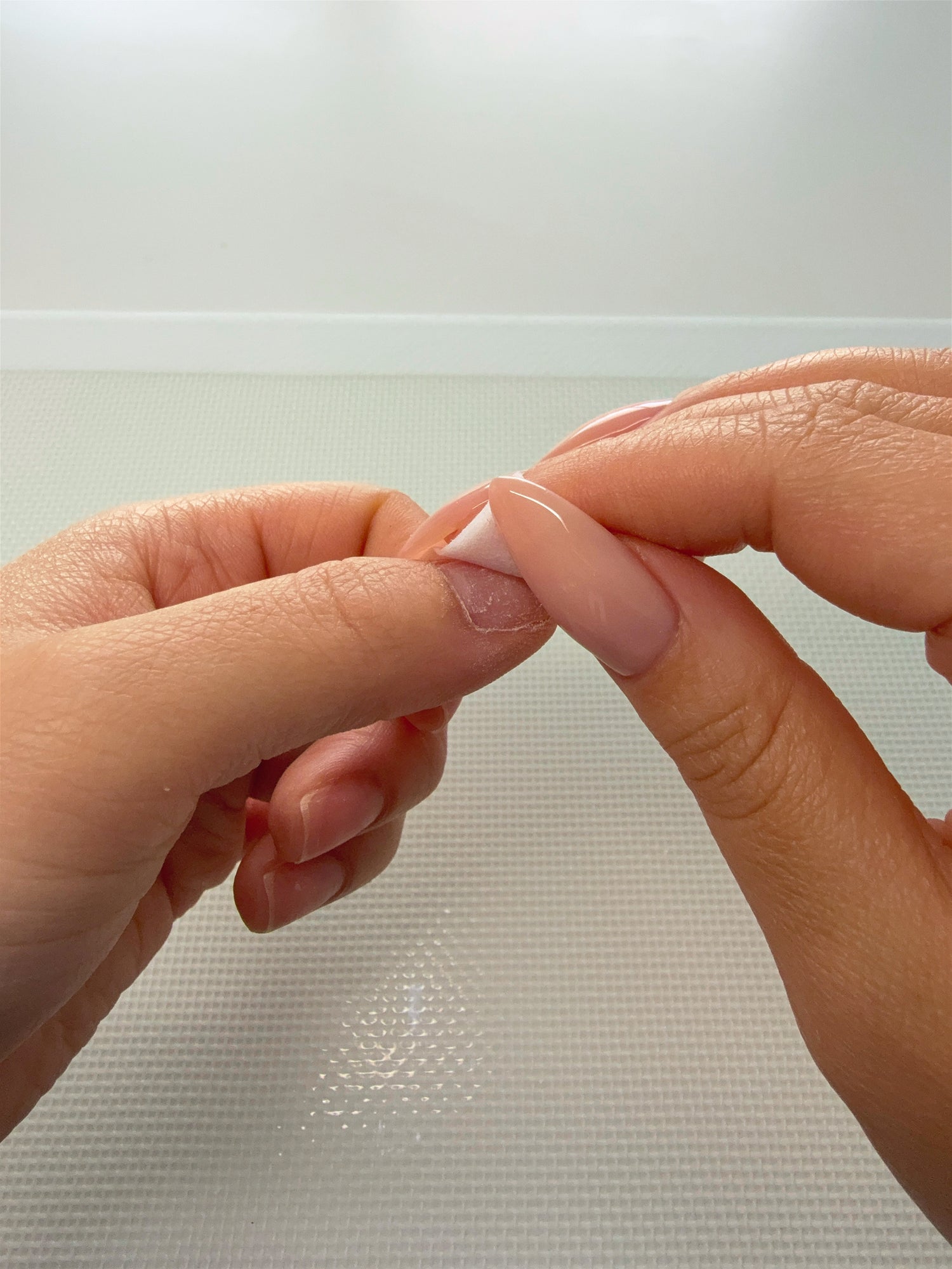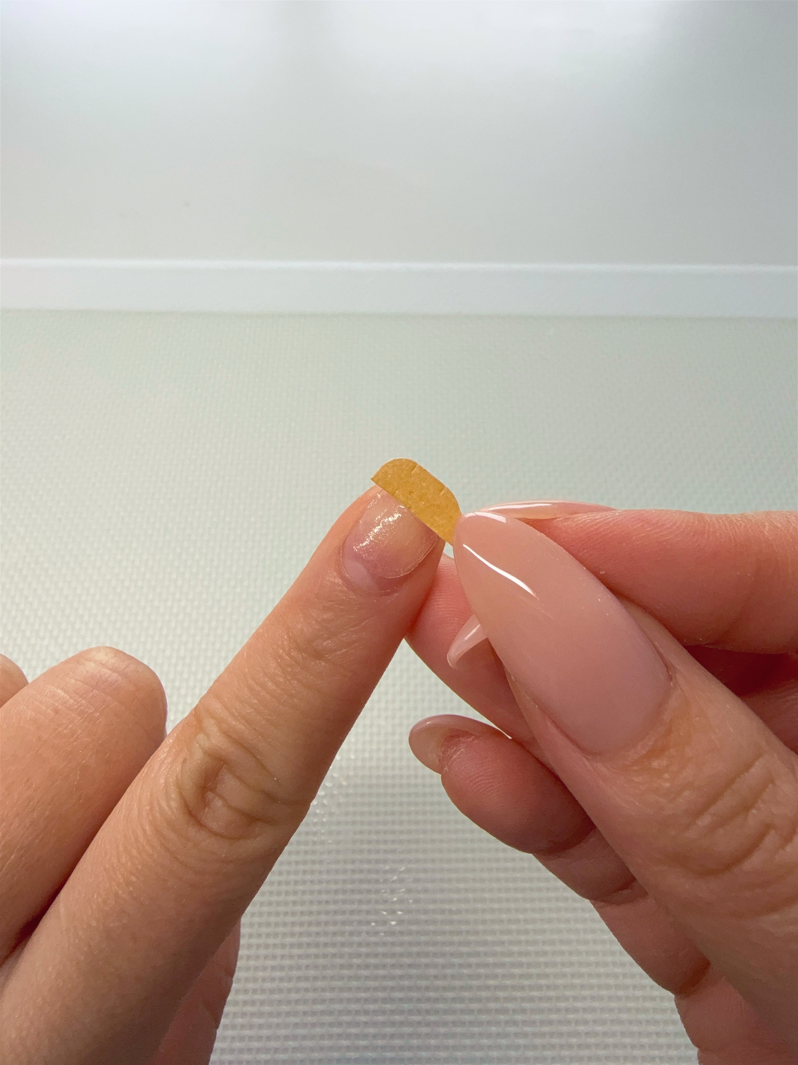 From here, with the nail still held at a slight angle, push the nail towards your cuticle so that it stretches out the end of the sticky tab to create a thin layer of adhesion.