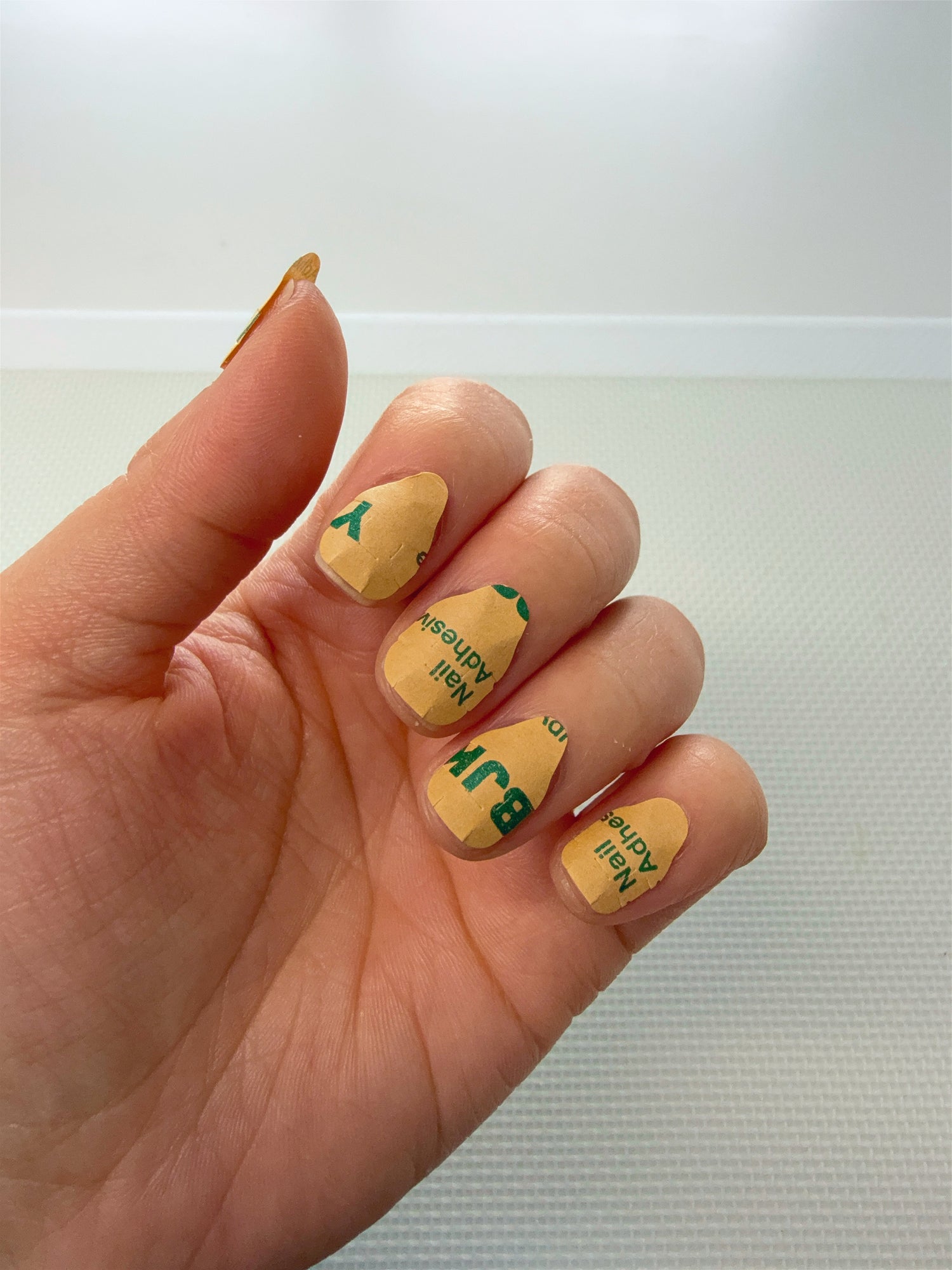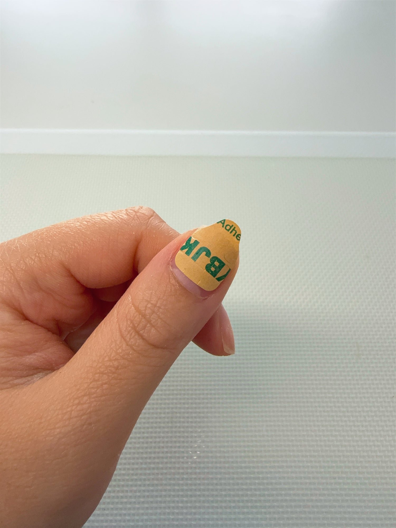 If you have a nail (or nails) that are curved from the cuticle line to the tip of your nail, you can cut an unused sticky tab.