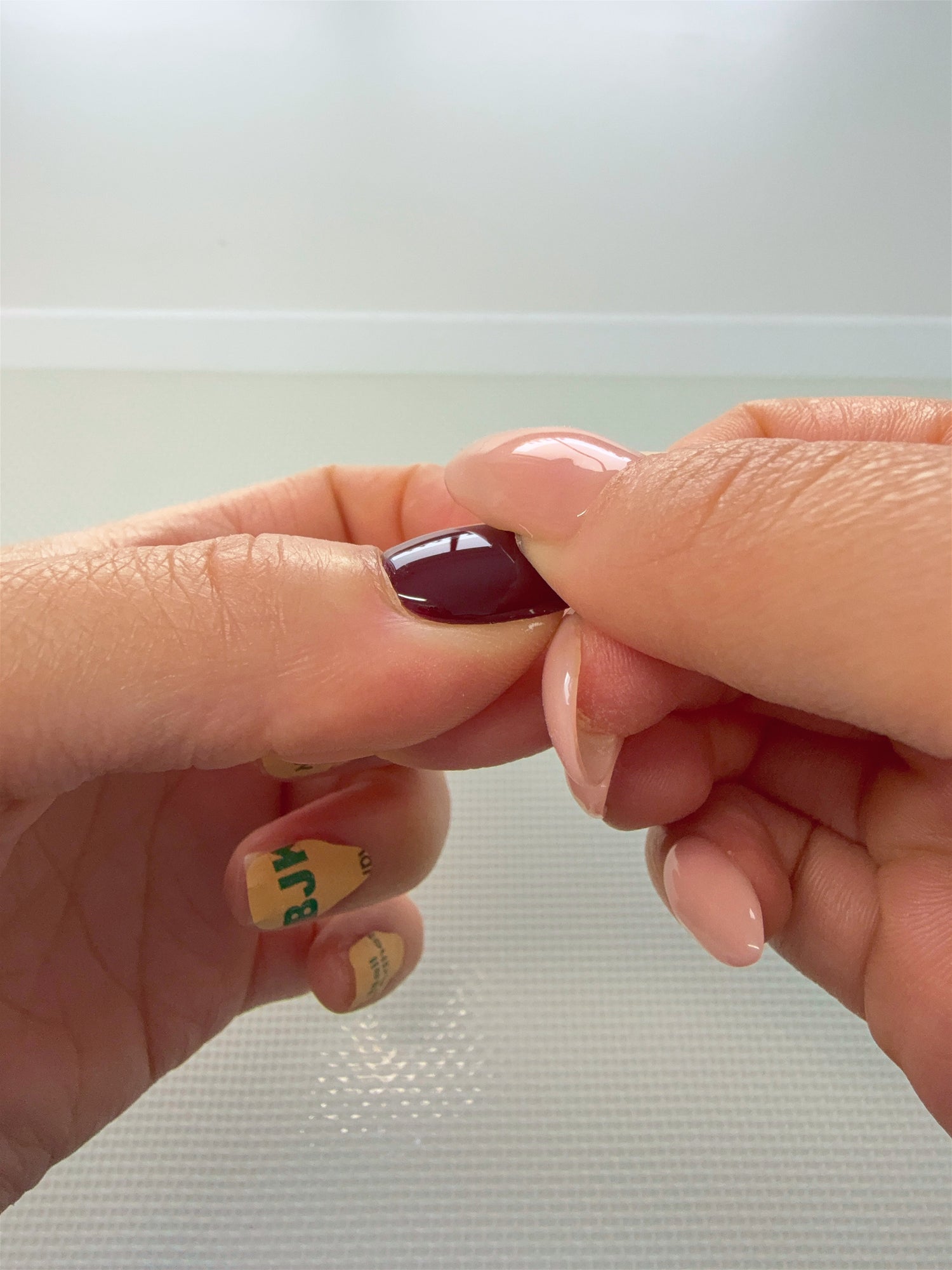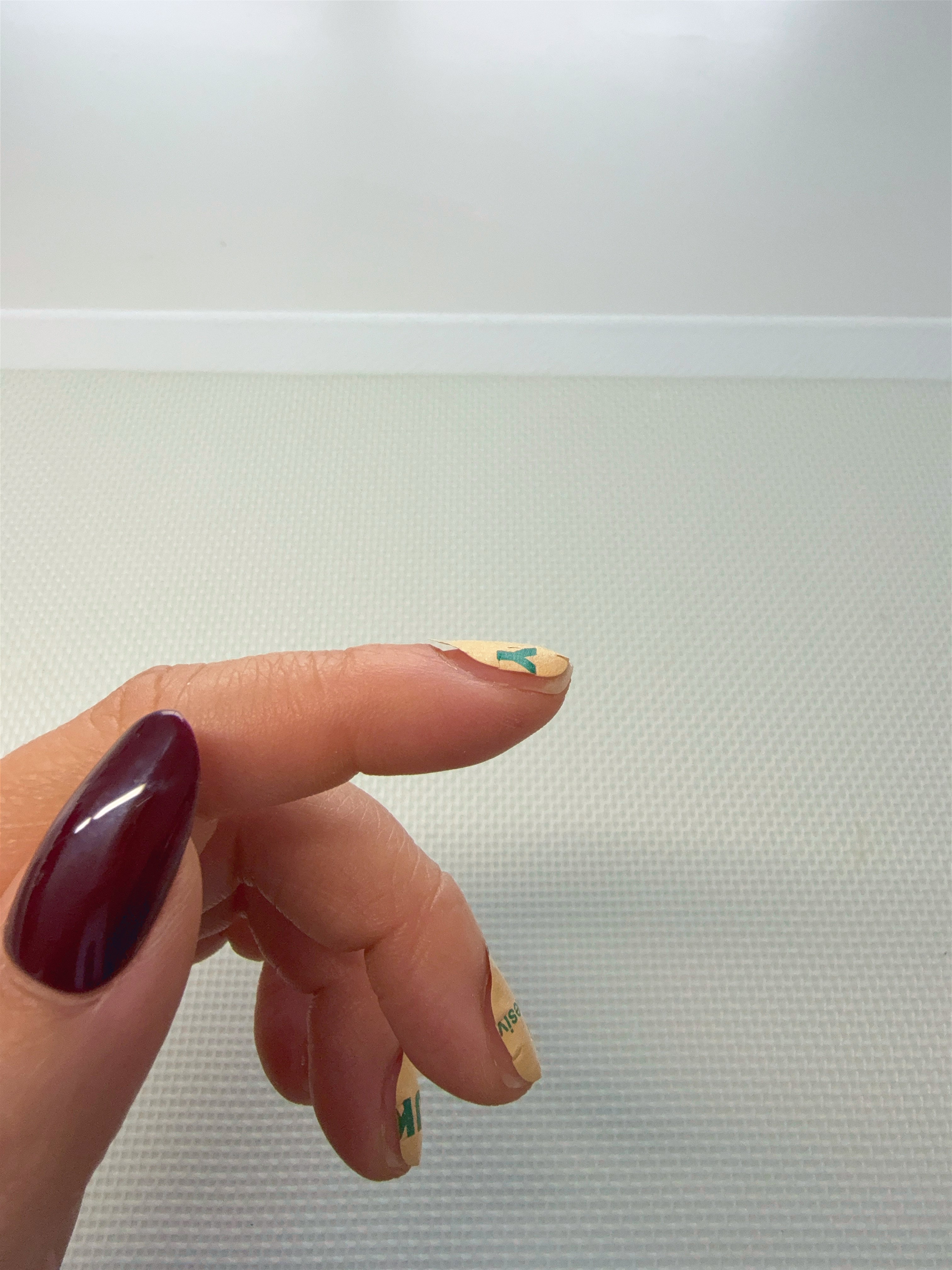 Attach the sticky tab right along the edge of the tip of your nail (without it going over). Don't stress if there is a bit of a gap along your cuticle line!
