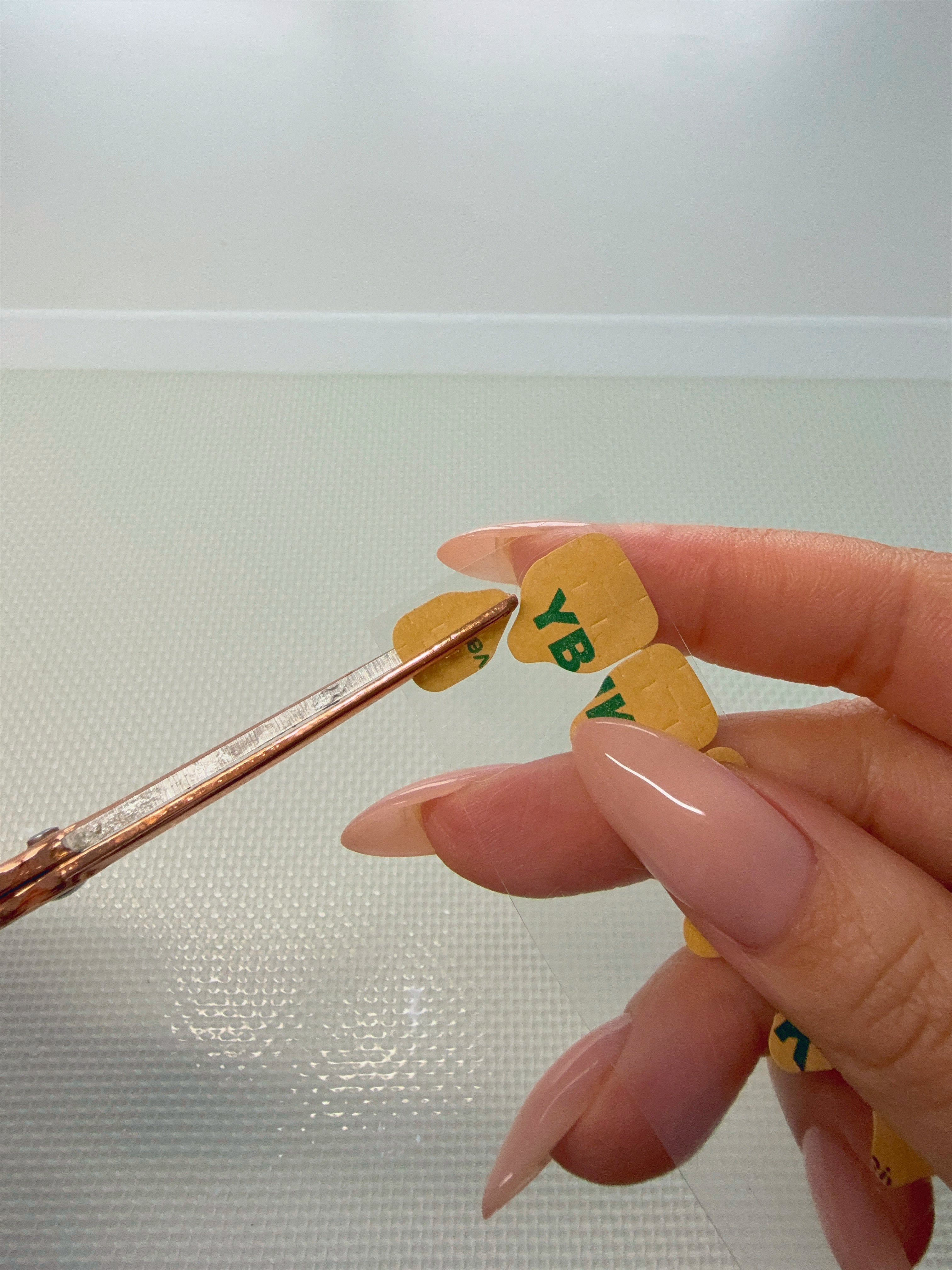 Size each sticky tab to your nails where it covers as much of the nail bed as possible without overlapping your cuticle or off of your nail bed. This can be attached in any direction as well.