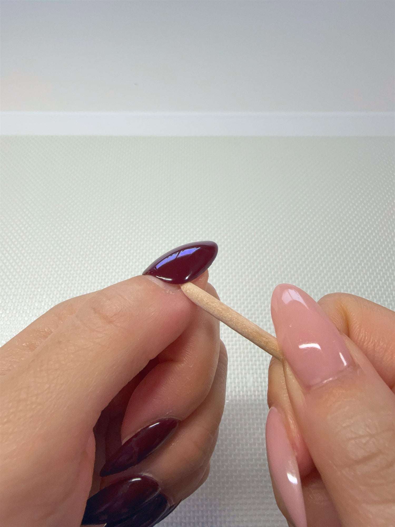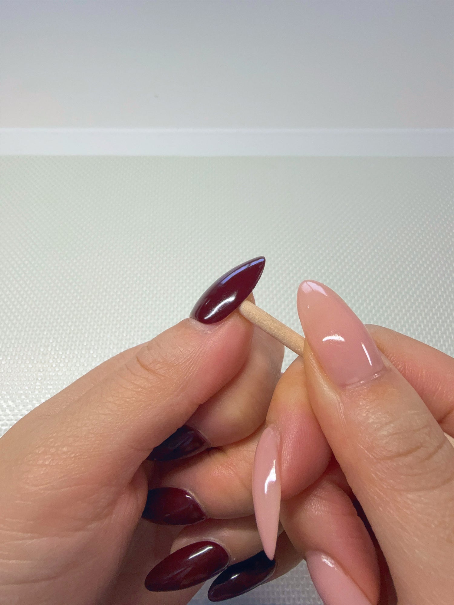 Using the wooden stick, begin creating separation from the sticky tab and the false nail.