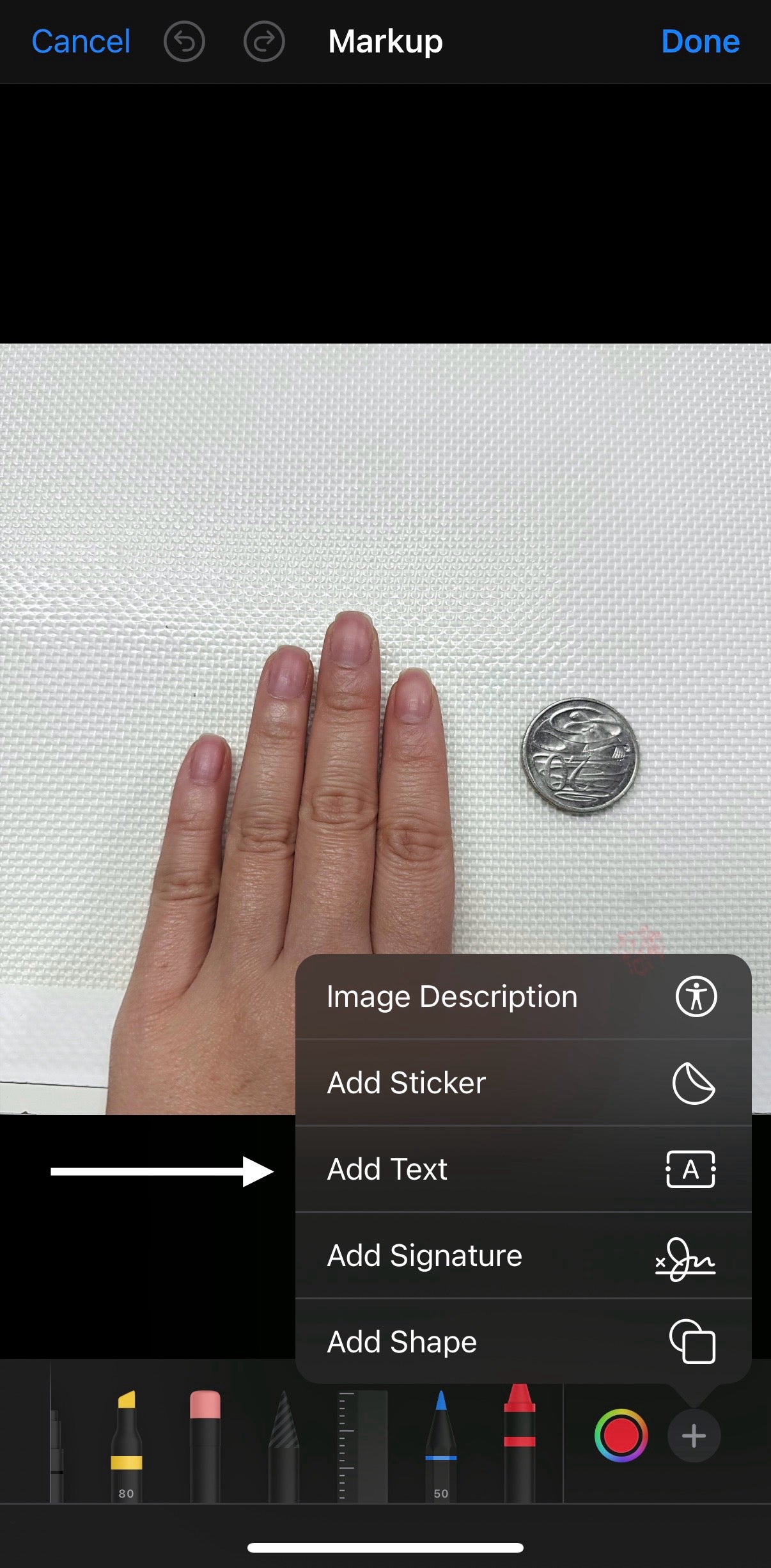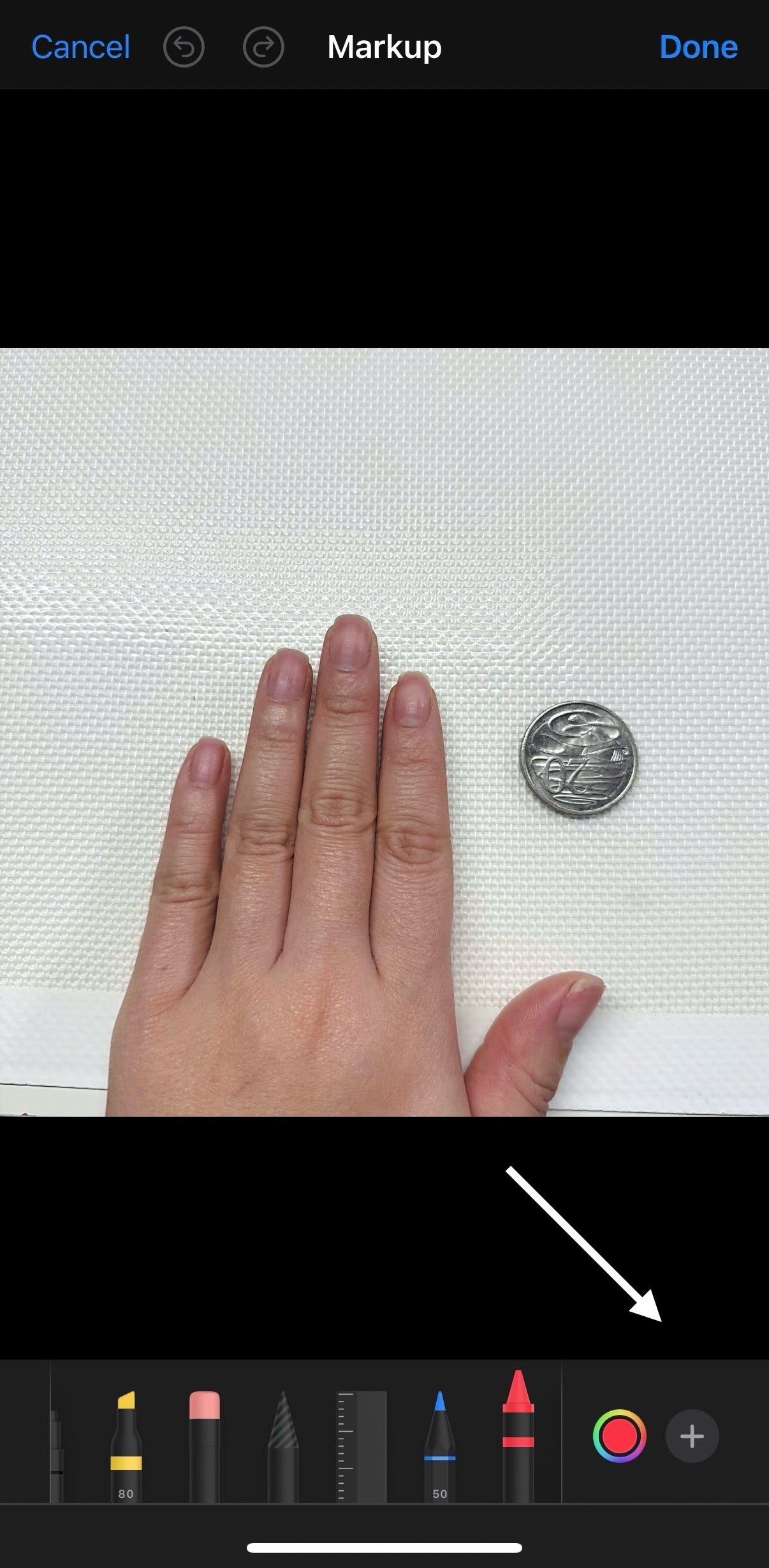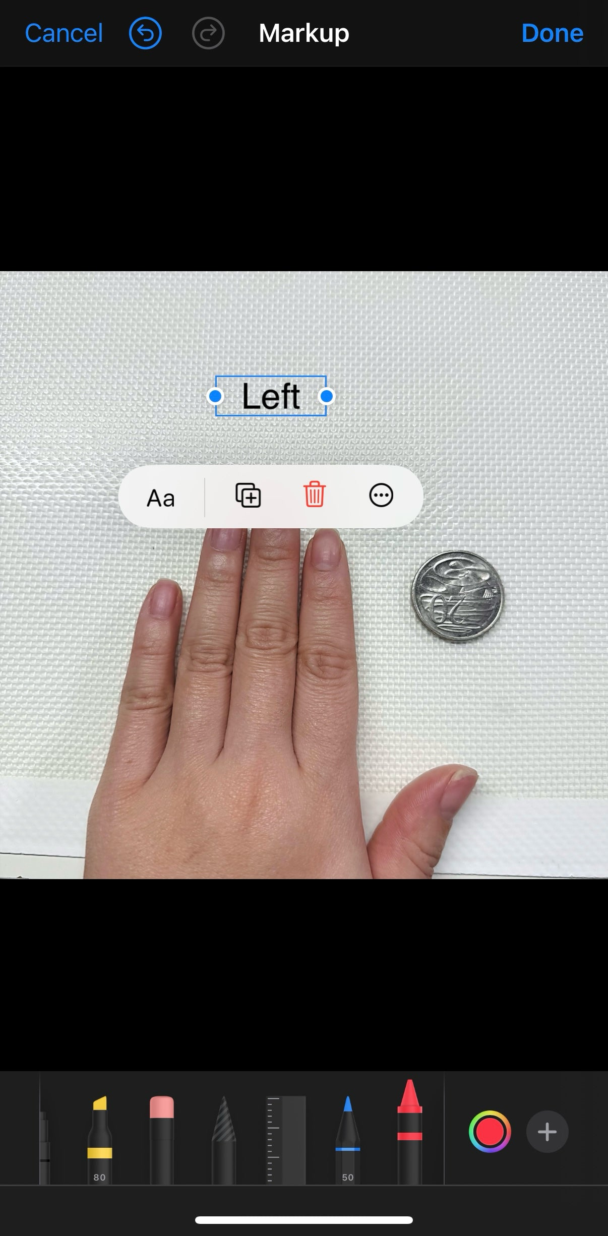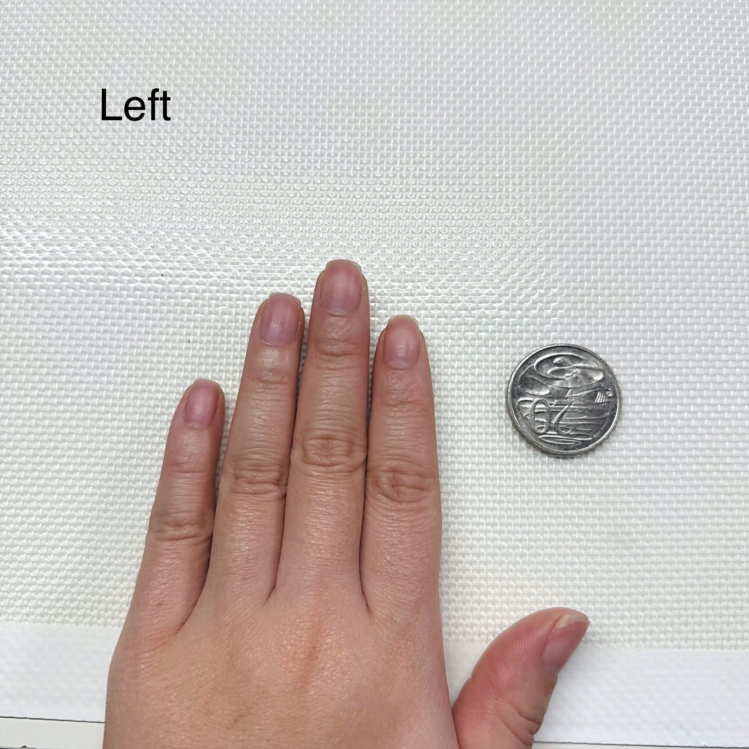 Have an Australian coin placed on a flat, clear surface. Place your hand next to the coin, and take a photo. Make sure the image is labelled to correspond with either your right or left hand.